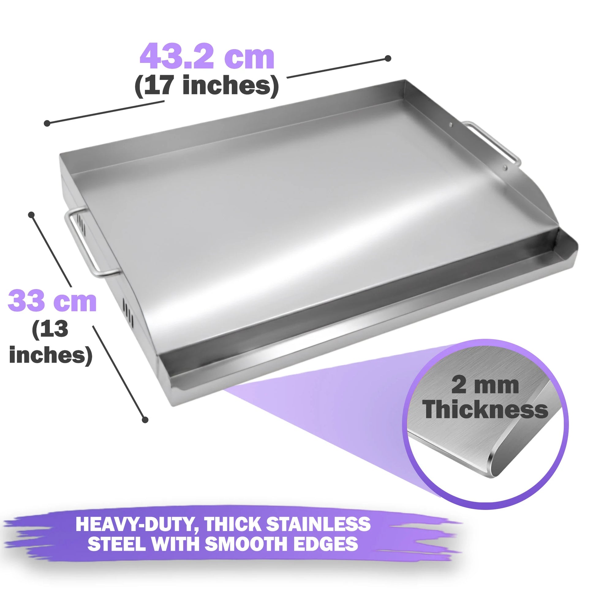 Crafted from heavy-duty 430 stainless steel with a solid 2 mm thickness, this BBQ grill griddle resists warping under high heat and promotes even heat distribution across the cooking surface. The stainless steel material is easy to clean and built to last through repeated grilling seasons.