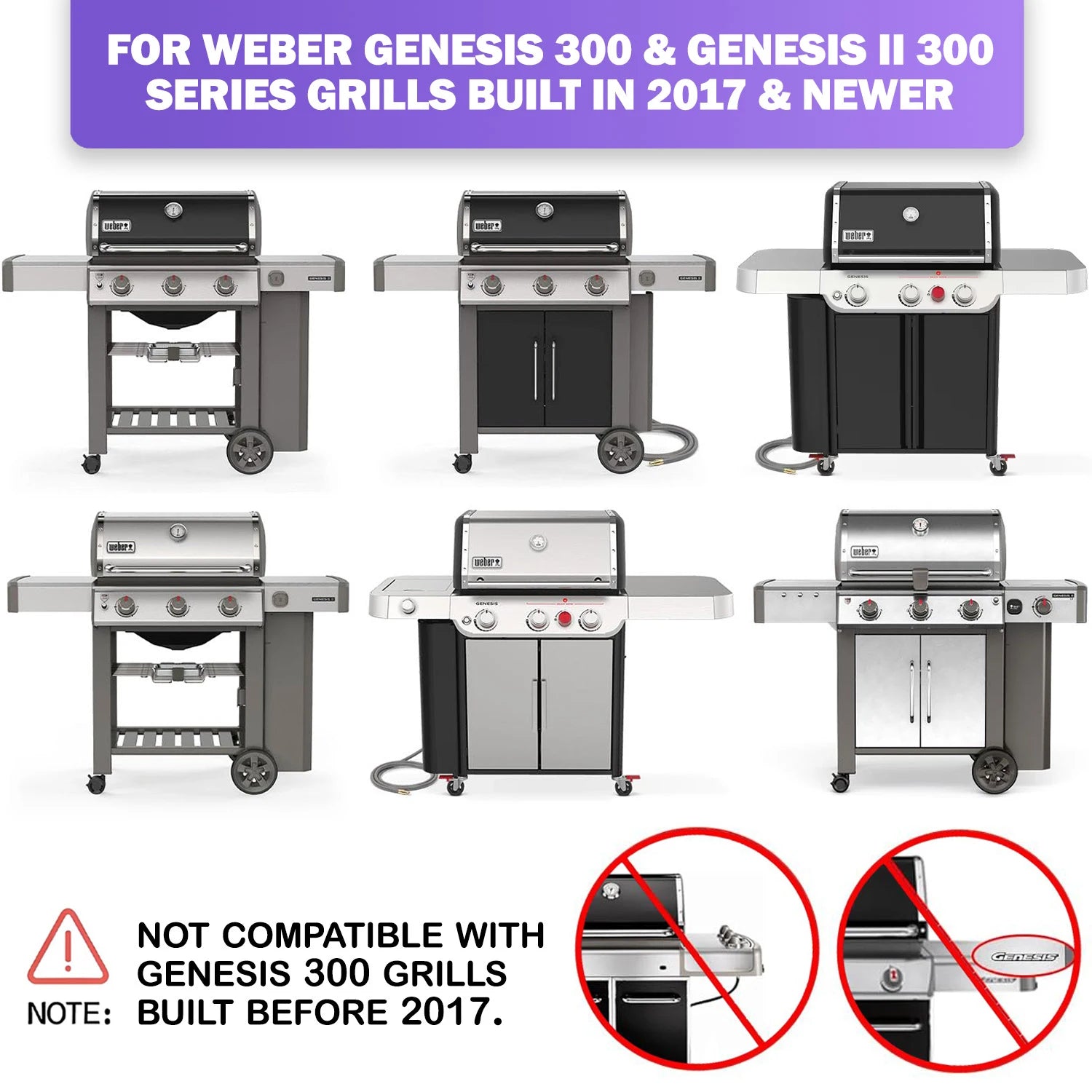 • Weber Genesis II 300 Series (2017 and newer): E-310; E-315; E-325; E-330; S-335; SE-330; SE-335; E-335; CE-330; CSE-315; CSS-315; CSS-335; CSE-335; E-340