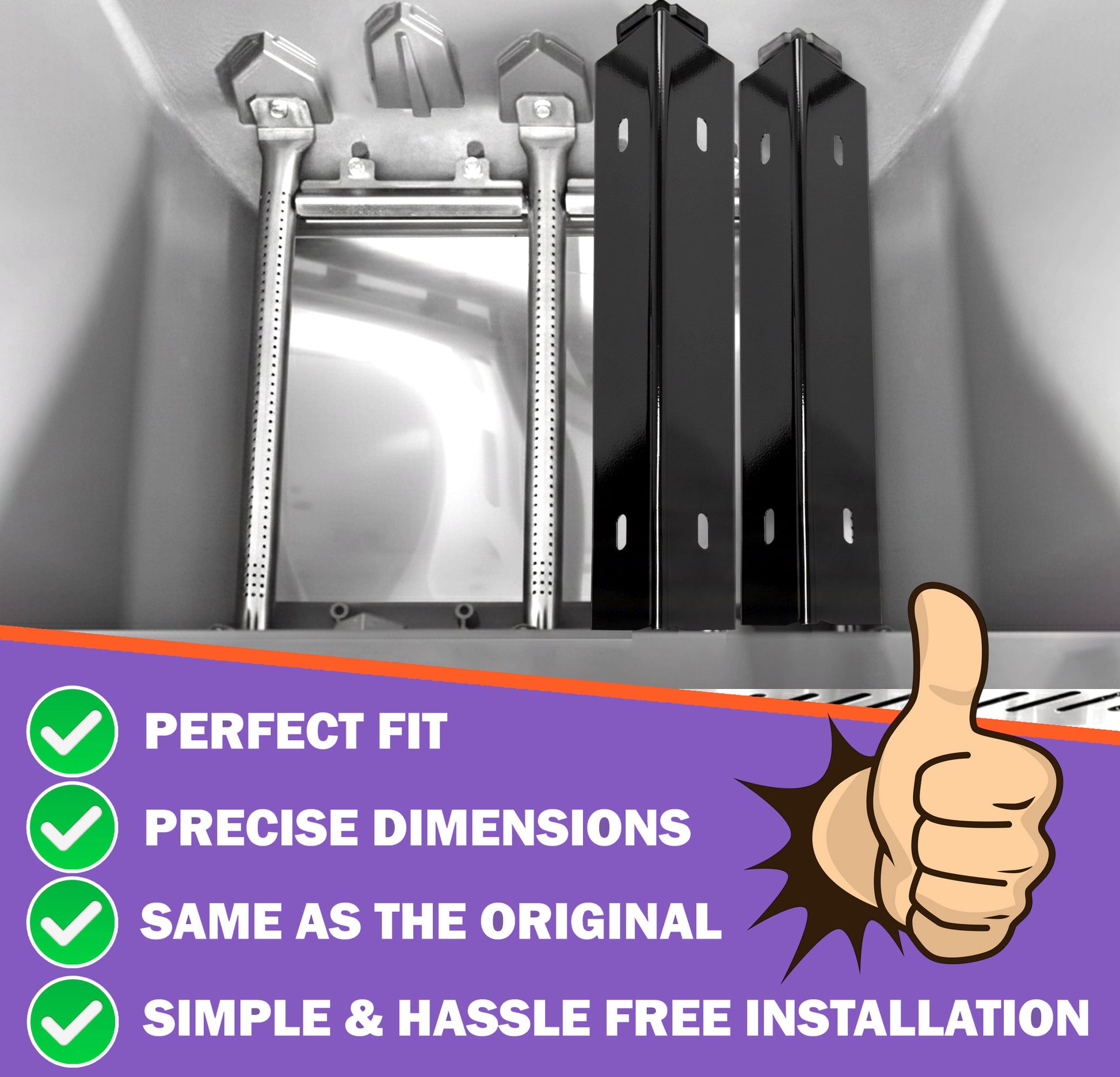Jokaisen posliiniemaloidusta teräksestä valmistetun lämmöntasauslevyn mitat ovat 41 cm (pituus) × 8,9 cm (leveys), mikä auttaa suojaamaan polttimia ja parantamaan lämmönjakautumista. Jokainen ruostumattomasta teräksestä valmistettu poltin on noin 43 cm pitkä ja valmistettu vankasta 1,2 mm ruostumattomasta teräksestä, mikä takaa luotettavan kaasun virtauksen ja pitkän käyttöiän.