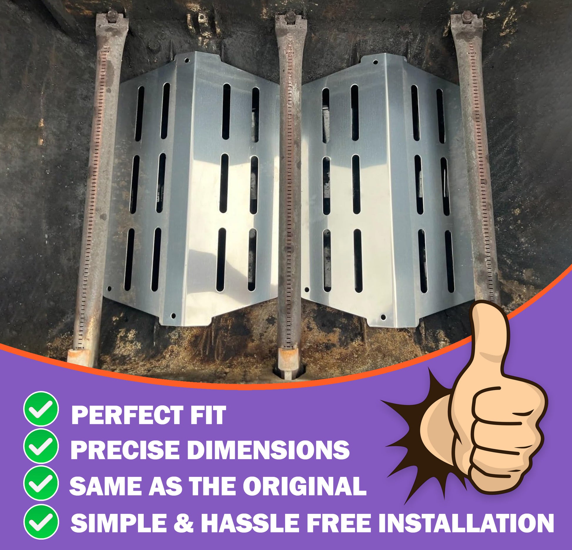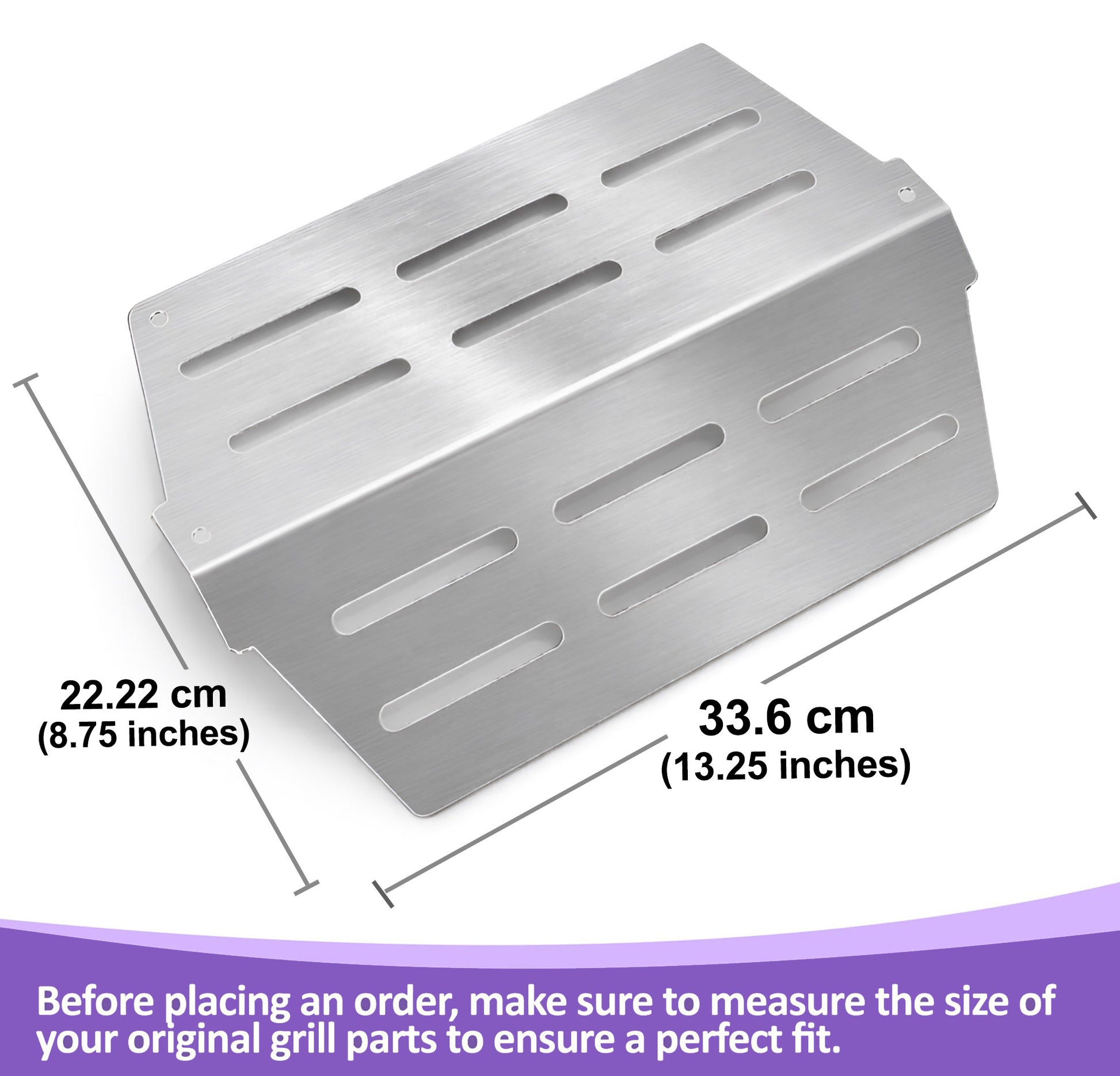 The package includes 2 × stainless steel Weber Genesis heat deflectors. For best results and to avoid returns, we recommend measuring your original Weber Genesis grill parts and verifying grill compatibility before placing your order.