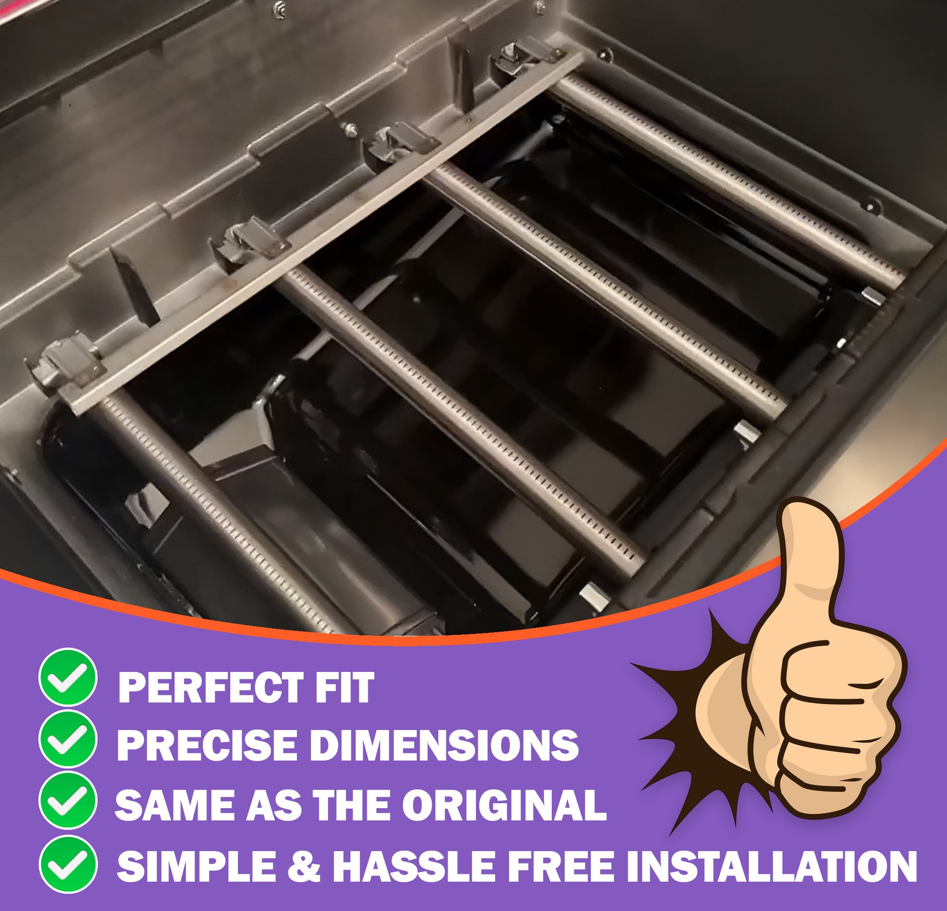 This comprehensive refresh kit includes 4 stainless steel gas burners and 1 crossover channel, serving as a direct replacement for OEM part numbers 4551203 and 4551213. To guarantee satisfaction, please confirm your grill model number and measure your original parts to ensure they match the dimensions listed above.
